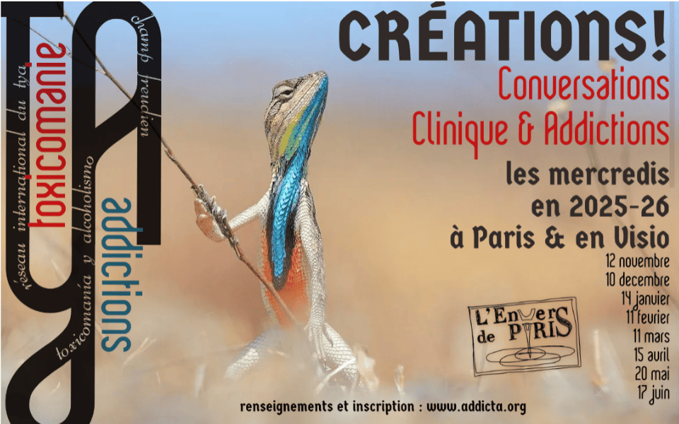 Le vecteur TyA Paris, conversations Clinique et Addiction, reprend ses activités pour l’année 2025-2026. Pierre Sidon, qui a porté et animé ce vecteur depuis sa création en 2013, nous en a transmis la responsabilité, avec l’accord de L’Envers de Paris, et nous les en remercions vivement. Le changement, c’est souvent l’occasion d’inventer, de réinventer, d’être créatif !