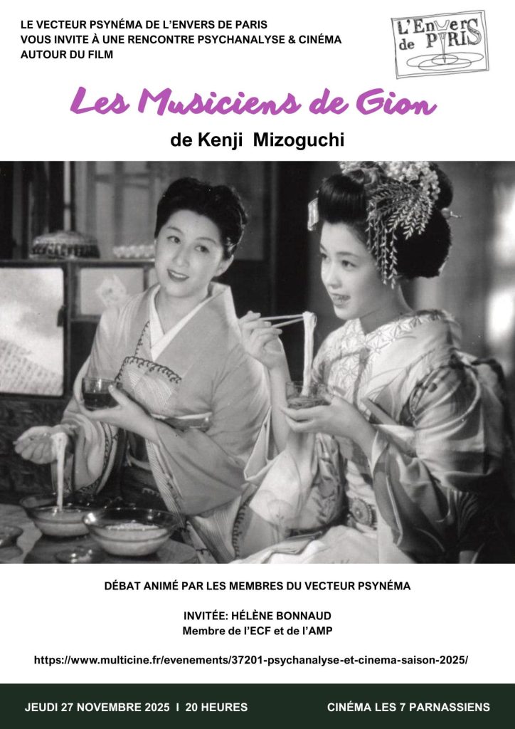La prochaine projection organisée par le vecteur Psynéma, suivie d’un débat, sera consacrée au film Les Musiciens de Gion de Kenji Mizoguchi.