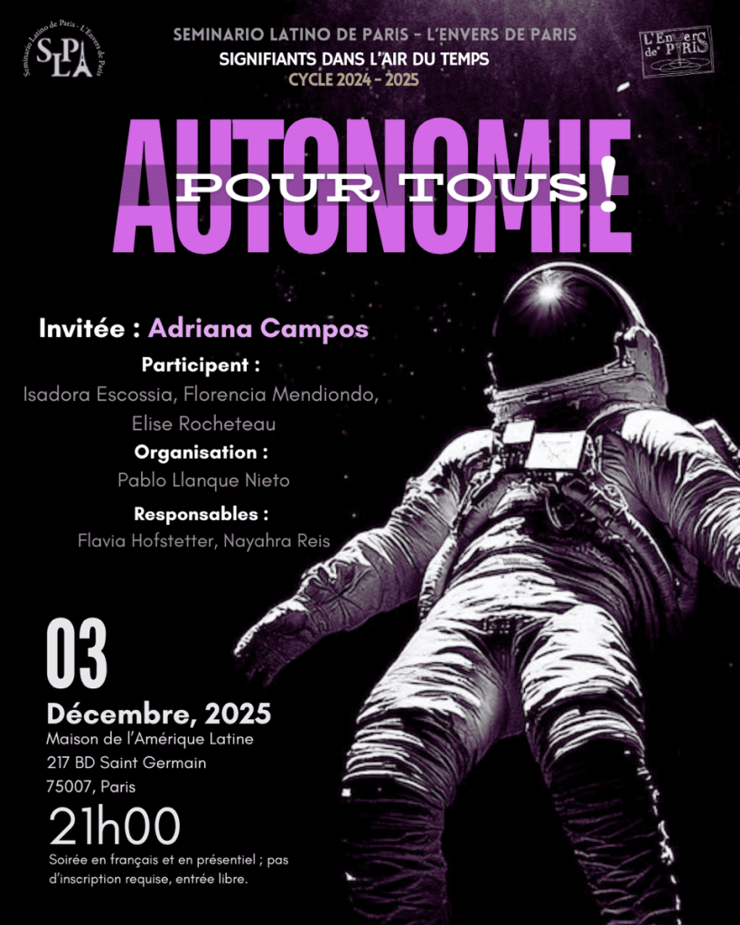 En novembre, le Seminario Latino de L’Envers de Paris poursuit son cycle d’études, « Signifiants dans l’air du temps », et prépare sa dernière soirée de l’année. Celle-ci aura lieu le mercredi 3 décembre en présence d’Adriana Campos comme invitée et sera consacrée au thème de la liberté et de l’autonomie.