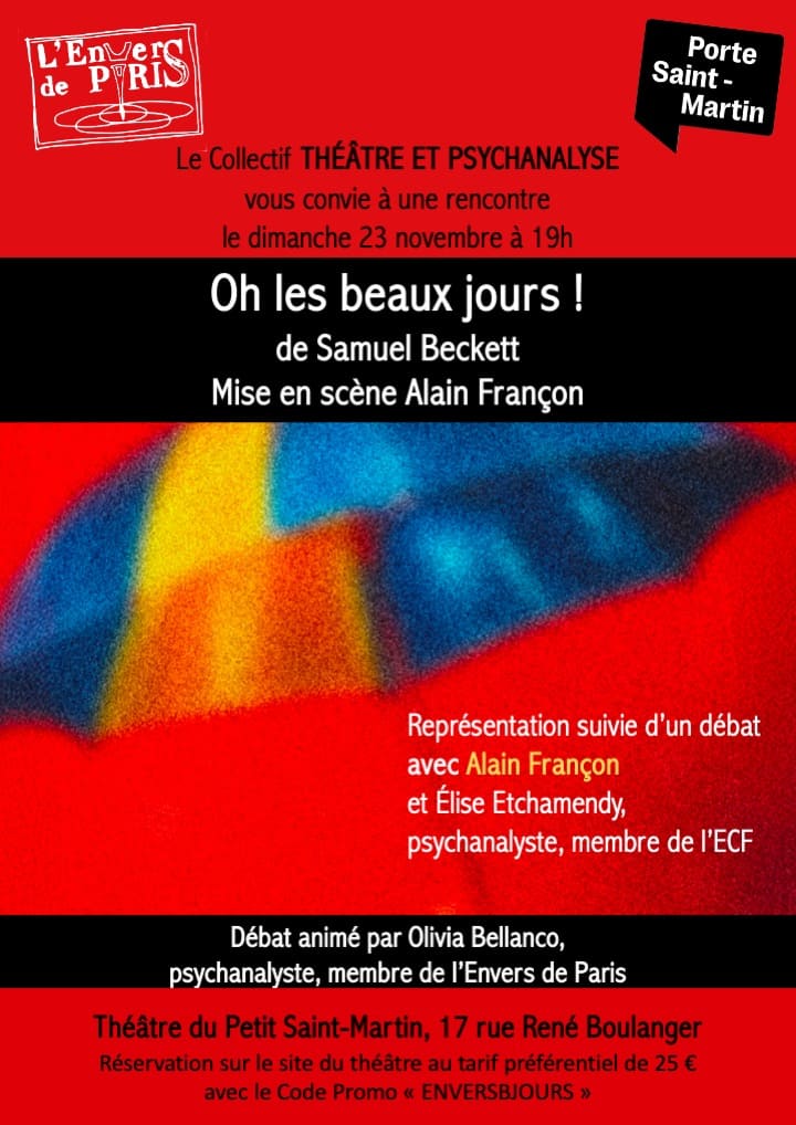 Le vecteur Théâtre et psychanalyse organise une rencontre, le dimanche 23 novembre à 19h, avec Alain Françon pour sa mise en scène d’Oh les Beaux Jours ! de Samuel Beckett.