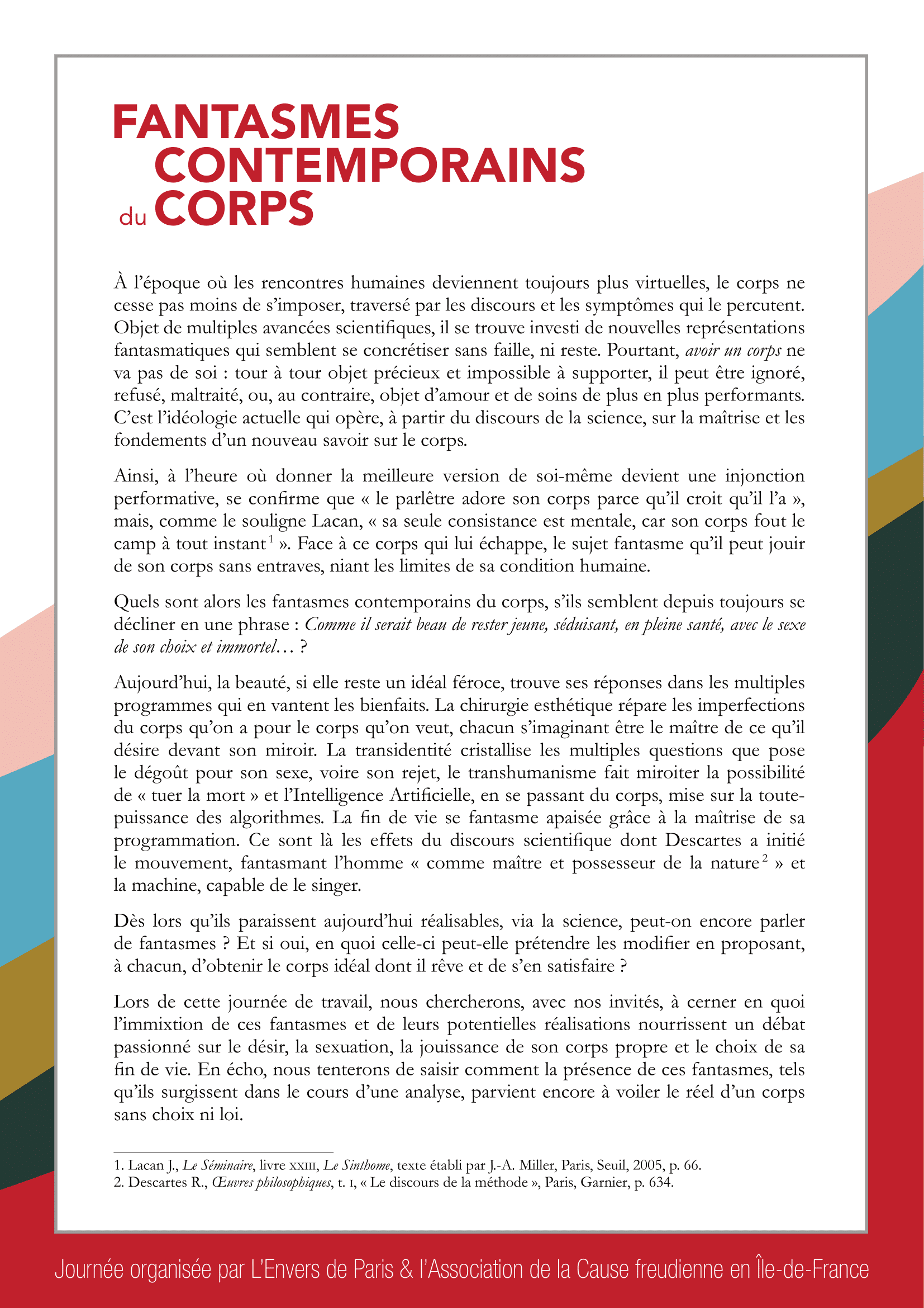 Lacan rappelait que le sujet aime son corps parce qu’il croit le posséder, alors qu’en vérité, il lui échappe sans cesse. Chirurgie esthétique, programmes de bien-être, transidentité, transhumanisme ou intelligence artificielle prétendent offrir la possibilité de se fabriquer le corps qu’on veut, et même de vaincre la mort. Mais, la science peut-elle réellement permettre à chacun d’obtenir le corps de ses rêves ? Le mirage du corps-machine serait-il l’horizon de cette recherche de maîtrise que la science promeut ? Rappelons-nous les mots de Jacques-Alain Miller :
