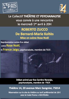 Le vecteur Théâtre et psychanalyse vous convie à une rencontre le mercredi 1eravril à 20h au Théâtre 14, après la représentation de Roberto Zucco de Bernard-Marie Koltès, mise en scène par Rose Noël. Les places sont en vente sur le site du théâtre et bénéficient d’un tarif préférentiel de 18 euros avec le code KOLTES26. France Jaigu a accepté d’être notre invitée.