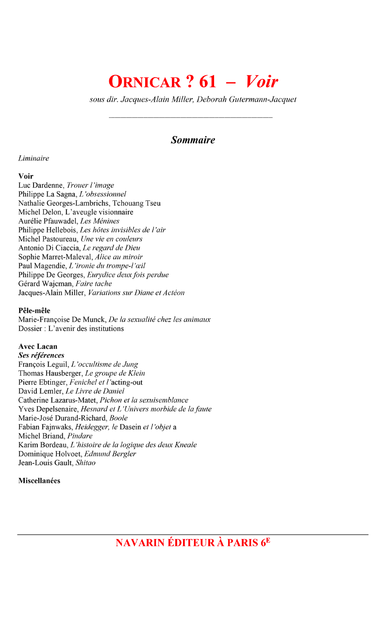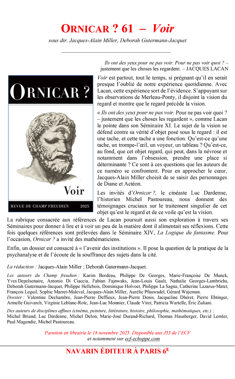 [2] Lacan J., « Joyce le Symptôme », Autres écrits, Paris, Seuil, 2001, p. 565.